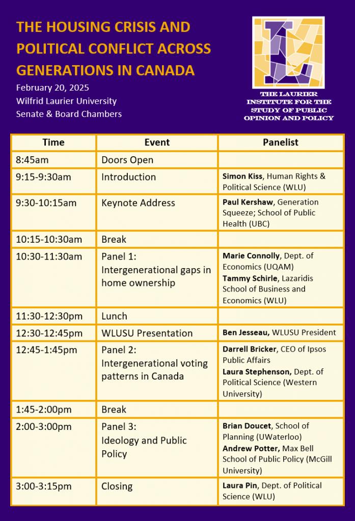 Bringing together diverse leaders in the housing policy sector, LISPOP (Laurier Institute for the Study of Public Opinion and Policy) is hosting its 3rd annual Forum on Public Opinion and Housing Policy. This years' forum will focus on the impact of housing on generational inequality. The day-long event will be held on February 20th, 2025, at Wilfrid Laurier's Waterloo Campus, from 9:00am-4:00pm.